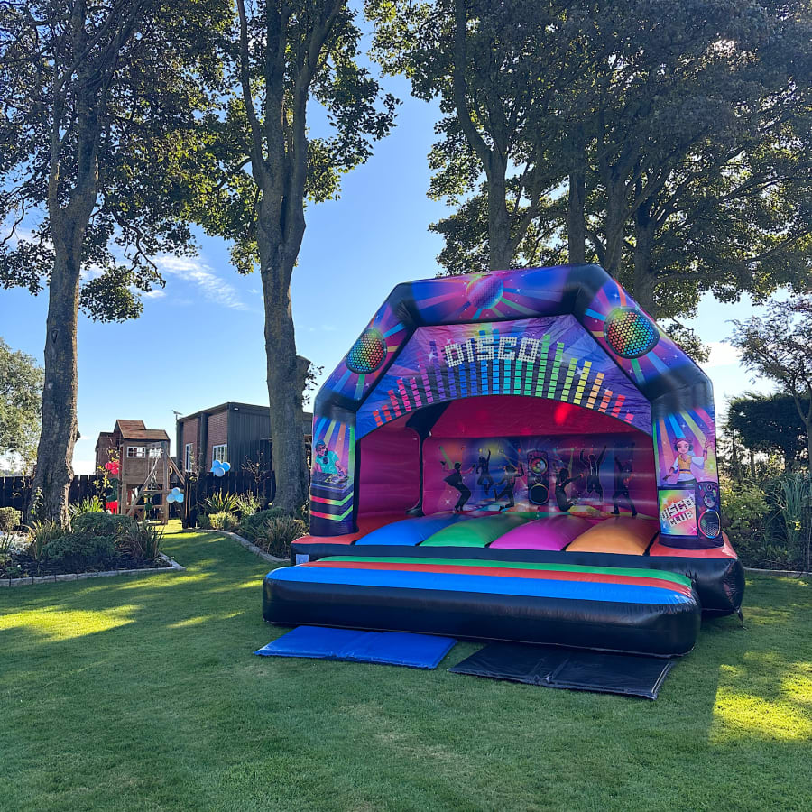This colourful 15ftx15ft disco bouncy castle is one of out most popular hires. The spacious layout is perfect for both jumping and dancing and not to mention your voice echoing from corner to corner. This inflatable is supplied with a Bluetooth speaker which you can connect with any device and it also comes with LED disco lights to give more of that 'disco themed feel' This inflatable colours stand out and automatically give you the feeling of excitement! Choosing this bouncy castle for a birthday, Wedding or a school event makes it perfect as it keeps energy high and because you can choose your own playlist it means the fun can go on for hours! Our Disco bouncy castle is suitable for all ages.